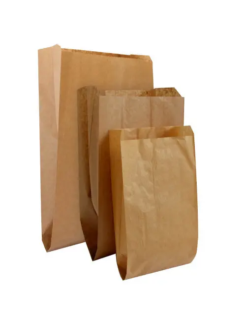 Ruskea elintarvikekelpoinen 100% kierrätyspaperista valmistettu paperipussi sivulevikkeellä. Kraft-paperia.